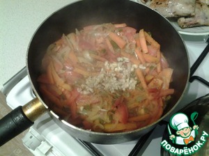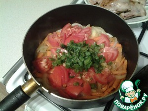 Добавляем помидоры и сельдерей, тушим минут 5, помешивая.