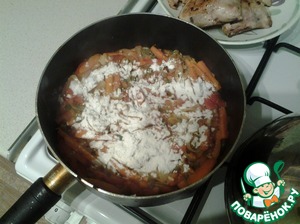 Всыпьте столовую ложку муки и помешивайте 1 минуту, влейте крутого кипятка 500 мл и доведите до кипения.