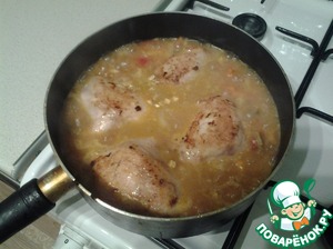 Добавляем лавровый лист, перец горошком и сушеный сельдерей. Пробуем на соль и перец. Если все по вкусу, то загружаем обратно бедрышки. Поглубже загружаем.