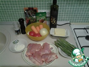 Это мои ингредиенты. Все овощи помыла и почистила. С куриных бедер я сняла кожу.