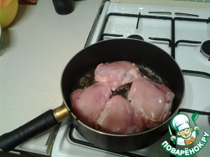 Опускаем в разогретое масло наши бедрышки и обжариваем на среднем огне 5 минут до золотистого цвета.