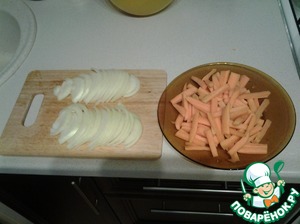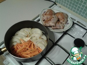 Пока наши бедрышки подрумянивались, я нарезала лук полукольцами, а морковочку крупными брусочками.
