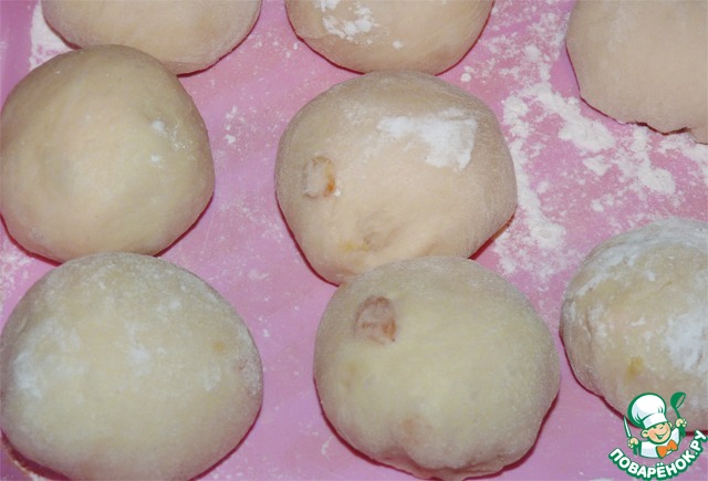 Тесто разделить на 9 частей и сформовать круглые булочки.
