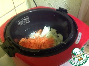 Лук режем полукольцами, морковь трем на крупной терке. Овощи выкладываем в чашу мультиварки с небольшим количеством оливкового масла, на режим ЖАРИТЬ 30 мин с открытой крышкой и время от времени помешиваем