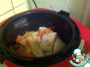Рыбу выкладываем к овощам, слегка лопаткой перемешиваем, чтобы овощи были не только внизу, но и сверху на рыбке. Ставим режим ВЫПЕЧКА 20 мин при закрытой крышке