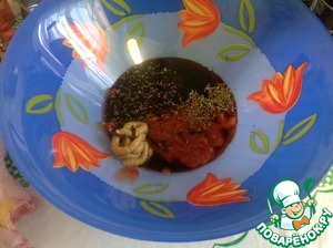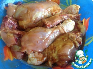 Окорочка разделяем на голень и бедро. Я снимаю кожу еще. В посуде для маринования делаем маринад: соевый соус, бальзамик, горчица, чили и все приправы перемешиваем.
