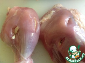 Чеснок режем на небольшие полосочки. Курочку ножом аккуратно надрезаем в нескольких местах и начиняем чесноком