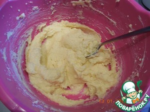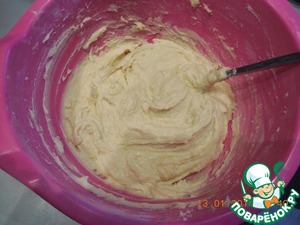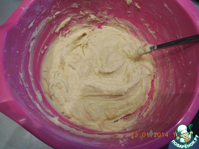 Потом небольшими порциями добавляем просеянную муку, крахмал. Получается довольно густая масса.