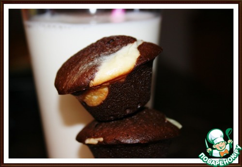 • 7. На дно формы мы добавляем по 1 ст. л. шоколадного теста, потом белой начинки, и сверху 1 ч. л. шоколадного теста. Я добавила слишком много теста, и они у меня получились с шляпкой :)