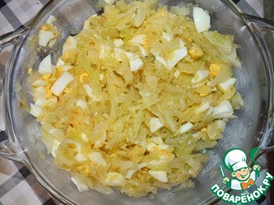 Вареные яйца нужно нарезать и смешать с капустой. Туда же добавить укроп. Я не добавляла, т. к. некоторые члены моей семьи не любят укроп. Начинка готова