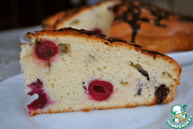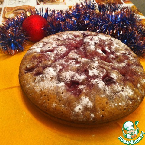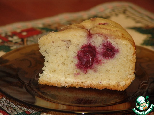 В общем, так: запекал в духовке при 180 градусах 45 минут, потом еще 15 минут доходило в выключенной. Красиво подрумянилось. Форма была диаметром побольше, нежели чашка мультиварки, поэтому получилась, в принципе, шарлотка с вишней. Но все очень вкусненько. Зачет!