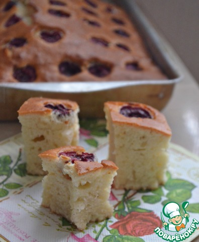 На верх пирога выложить вишню (я выкладывала вместе с соком). Посыпать сахаром.