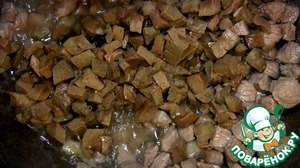 • Нарезать печень мелкими кубиками. Сало немного подморозить и тоже нарезать мелко. Мясо нарезать мелкими кубиками.