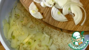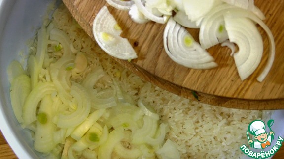 Перемешать лук с рисом и добавить оливковое масло 50 мл.