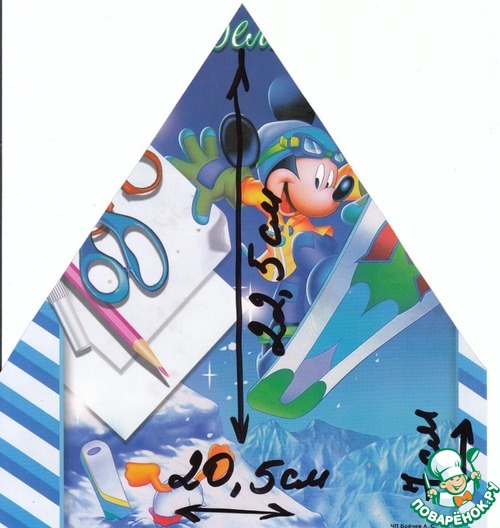 1. Фронтальные стороны. Из А4, длина 20,5 см., ставим точку на центре и проводим линию вверх на 22,5 см. С двух сторон высоту ставим 7 см., ставим отметку, и от этой отметки к центру вверх проводим линию.