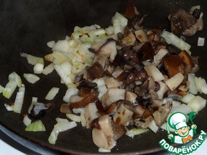 К луку добавляем грибы и обжарим до исчезновения жидкости от грибов.