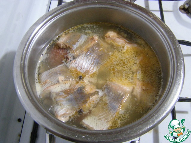 Голову, шкуру и кости сложить в кастрюлю, добавить морковь, неочищенный от кожуры репчатый лук, корневой сельдерей, специи, залить водой и поставить вариться