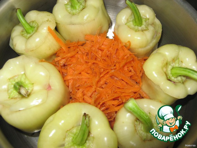 • На дно кастрюли налить немного растительного масла. Сложить вертикально в неё перцы. Закрыть их крышками из плодоножек. Туда же положить морковь.