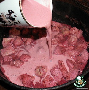 Смешиваем в блендере вишню и кефир. Заливаем курочку и накрываем сковородку крышкой. Еще минут десять она у нас там тушится.