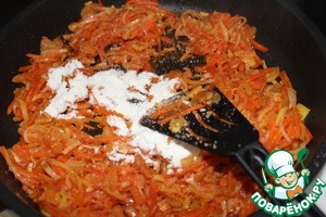 Затем всыпала муку, посолила, поперчила, хорошо перемешала.