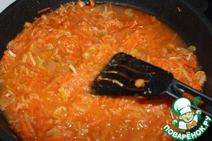 Все овощи положила в глубокую разогретую с растительным маслом сковороду, добавила протертые помидоры и слегка обжарила.