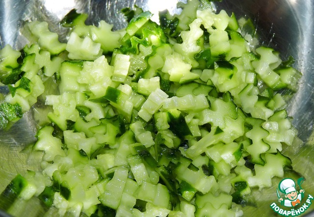 Огурец нарезать тонкими брусочками или пластинками, я использовала фигурный нож.