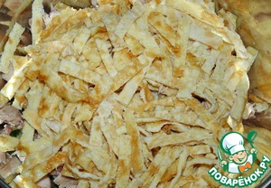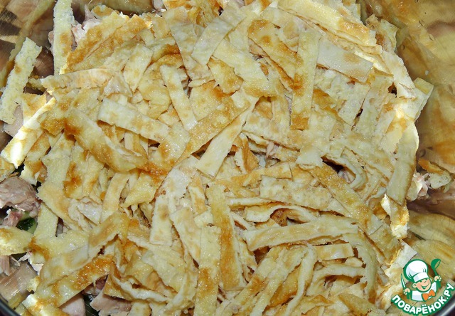 Смешать огурцы, куриное филе, лук, соломку из блинчиков, посолить, добавить майонез и перемешать до однородности салата.