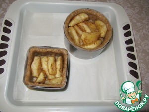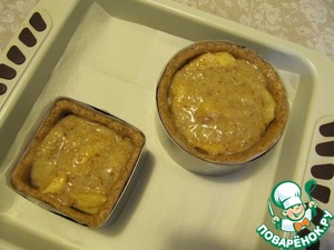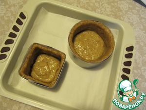 Вложить в формы для выпечки подготовленное тесто, хорошенько прижимая руками со всех сторон. Я сразу перенесла их в форму для выпечки, застеленную бумагой. На дно выложить по паре ложек миндального крема толщиной около 5 мм,