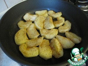 Для начинки яблоки очистить от семян и кожуры, нарезать тонкими дольками. На сковородке растопить сливочное масло, выложить дольки яблок, посыпать корицей и коричневым сахаром (слегка) для лучшей карамелизации, обжарить с двух сторон. Переворачивать аккуратно, чтобы не помять кусочки. Выложить на тарелку, карамелизировать оставшие яблоки.