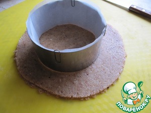 Тесто раскатать до толщины 1,5 - 2 см (примерно), затем вырезать из него круг, больший диаметра дна на высоту стенок формы.