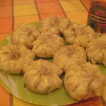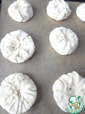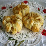 Переложить хризантемки (правда, пока они похожи на узелки-мешочки) на противень, застеленный пекарской бумагой. Смазать желтком.