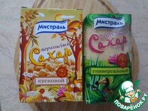 Для этого рецепта я взяла два вида сахара от ТМ Мистраль: коричневый универсальный и коричневый кусковой.