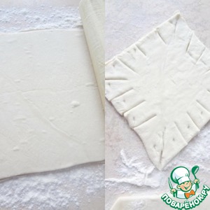 Раскатать тесто в одном направлении до увеличения длины примерно в 2 раза. Разрезать на 8 частей. Ножом сделать лучики.