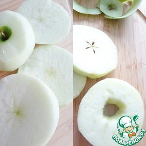 Яблоки помыть, почистить, разрезать шайбами на 4 части, вырезать сердцевину.