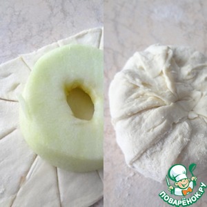 Положить шайбу яблока на заготовку из теста, обернуть лучики вокруг яблока, соединяя их в центре. Лучики нужно стараться располагать плотнее.