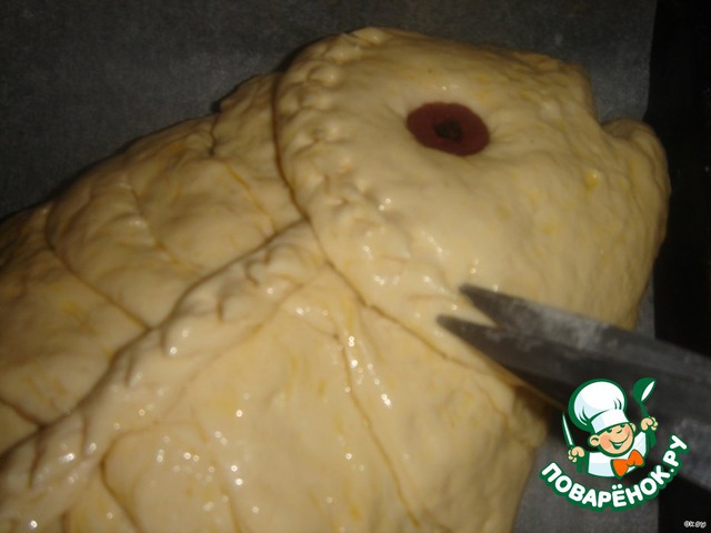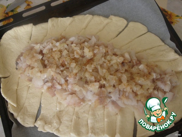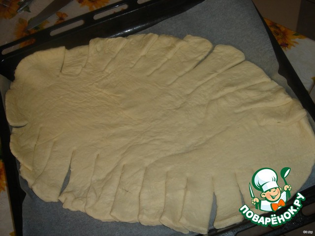 Размороженному тесту придаем форму овала (обрезки нам еще пригодятся) и перекладываем на противень, застеленный пекарской бумагой. Тесто нужно положить по диагонали, рыбка будет большая.