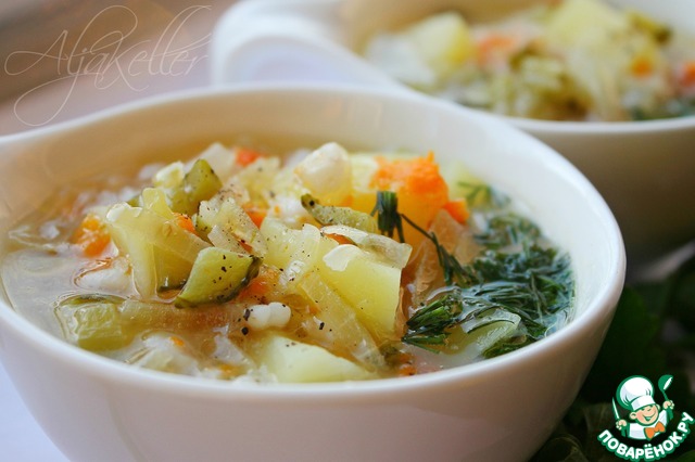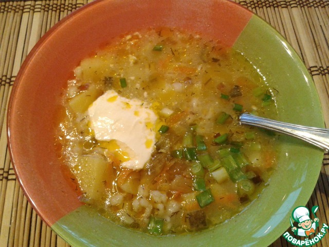 Через 15 мин варки супа добавить крупу перловую, лавровый лист, рассол, сок лимона и проварить 5 мин. Суп готов.