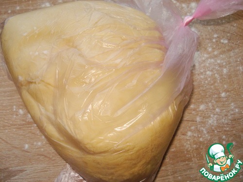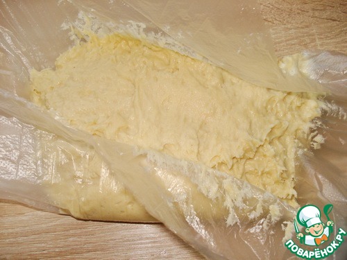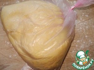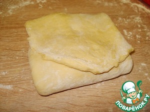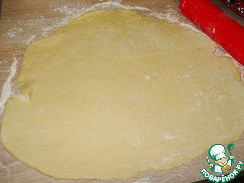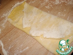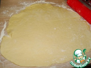 В холодильнике тесто немного подошло. Тесто выложить на подпыленный мукой стол, сначала руками, а потом скалкой, присыпая мукой, раскатать в прямоугольник.