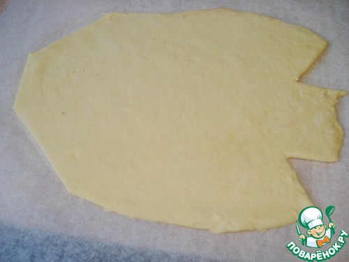 Другую часть раскатываем, не забываем немного присыпать мукой, если липнет, в прямоугольник. Это лучше делать на пергаментной бумаге или на коврике. Отрежьте два угла, а затем два маленьких треугольника на другом конце теста.