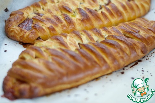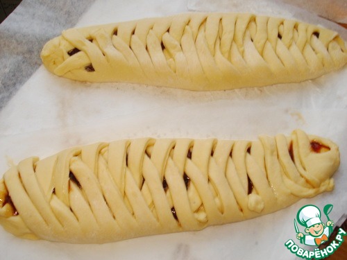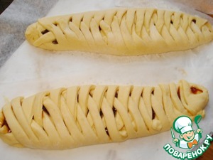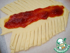 Выложите начинку посредине. По бокам вырезать косые полоски.