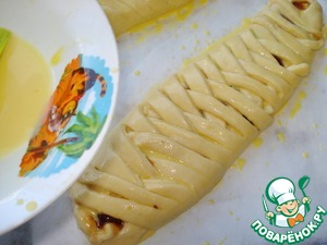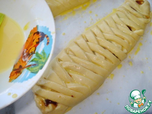 Смажьте косы яичным желтком, взбитым с 2 столовыми ложками молока. Смажьте косы.