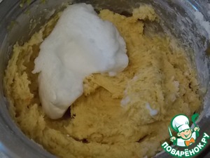 Добавить муку и хорошенько перемешать. Затем аккуратно ввести белки.