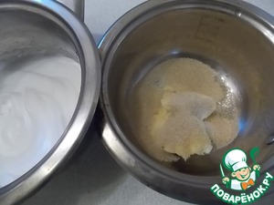 Белки отделить от желтков и взбить до твердых пиков. В размягченное масло положить сахар и взбить добела.