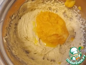 Во взбитое масло положить желтки. Взбить. Положить мандариновое пюре и еще немного взбить. -