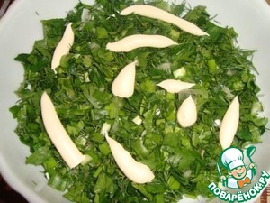 На грибы мелко режем зелень и хорошо утрамбовываем, смазываем все майонезом.