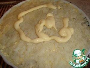 Трем сыр на крупной терке, выкладываем и смазываем майонезом.