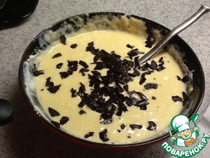 Шоколад натираем или режем. Добавляем в тесто. Перемешиваем.