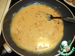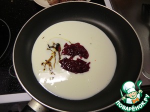 Сливки, соевый соус, половинку кубика мясного бульона и брусничное варенье выкладываем в сковородку. -