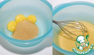 Поставим молоко на огонь и доведём до кипения. За это время хорошо смешиваем яичные желтки с коричневым сахаром.