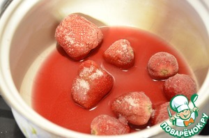 В кастрюльку выкладываем замороженную клубнику, заливаем вином, добавляем 2 столовых ложки сахара и увариваем на среднем огне около 10 минут, непрерывно помешивая.